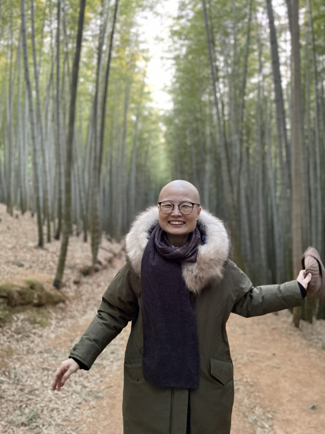 신나리 감독이 투병 중 대나무 숲을 찾아 활짝 웃는 모습. 빛누리출판사 제공