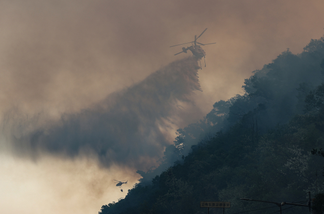 28일 오후 2시 1분께 대구 북구 노곡동 함지산에서 발생한 산불이 확산하는 가운데 헬기가 산불을 끄고 있다. 연합뉴스