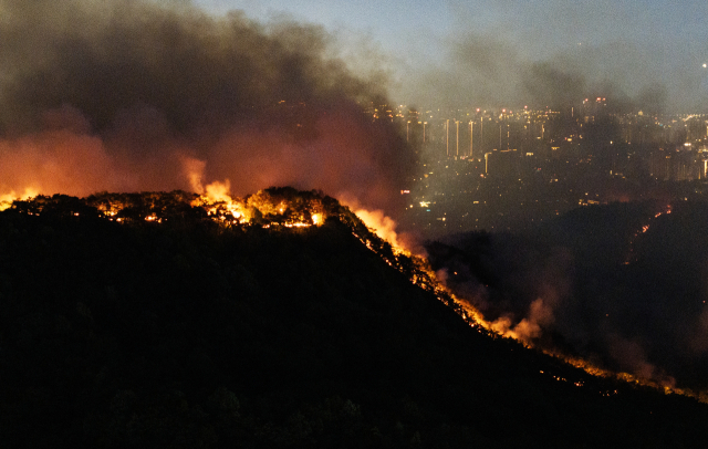 28일 오후 2시 1분께 대구 북구 노곡동 함지산에서 발생한 산불이 야간에도 확산하고 있다. 연합뉴스