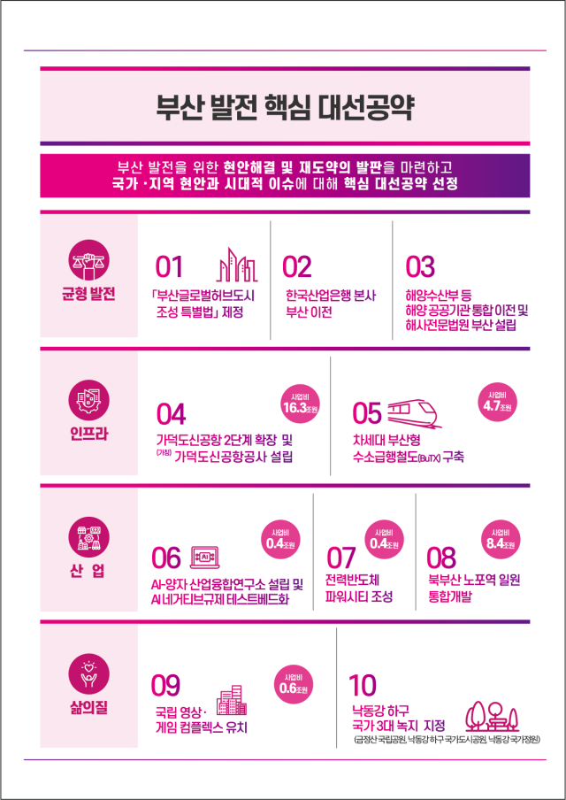 또 산업 분야에는 △인공지능(AI)·양자 산업융합 연구소 설립 및 AI 네거티브 규제 테스트베드화 △전력 반도체 파워시티 조성 △북부산 노포역 일원 통합 개발, 삶의 질 분야에는 △국립 영상·게임 콤플렉스 유치와 △낙동강 하구 국가 3대 녹지(금정산 국립공원, 낙동강 하구 국가도시공원, 낙동강 국가정원) 지정이 들어갔다.