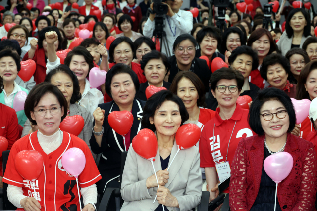 국민의힘 김문수 대선후보 배우자 설난영 여사(가운데)가 21일 서울 여의도 중앙당사에서 열린 정정당당여성본부 필승결의대회에서 참석자들과 기념촬영을 하고 있다. 연합뉴스