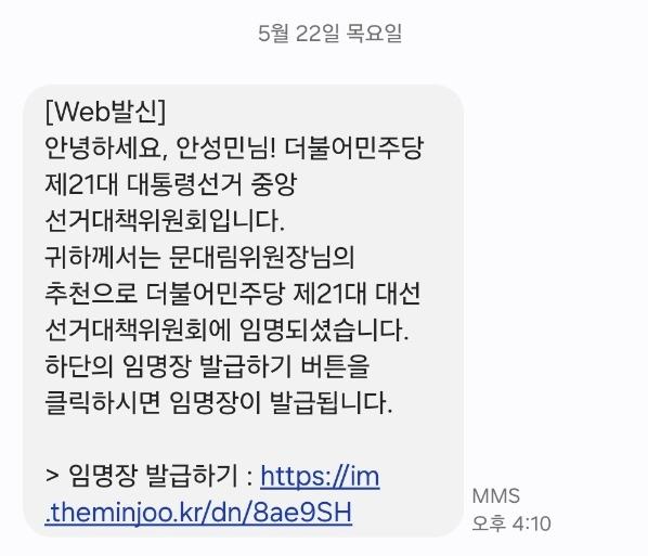 세부 내용을 살펴보면 ‘귀하께서는 문대림 위원장님의 추천으로 더불어민주당 제21대 대선 선거대책위원회에 임명됐다’는 글과 함께 임명장 발급 링크가 포함됐다.