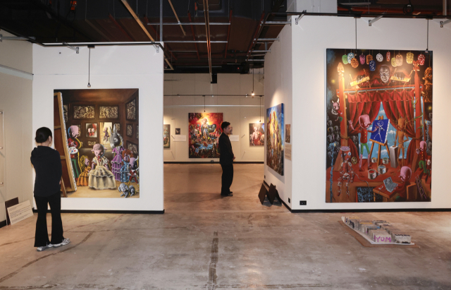 모야의 ‘모야의 시녀들’ 등이 전시되고 있는 지그재그아트센터 전시장 전경. 정대현 기자 jhyun@