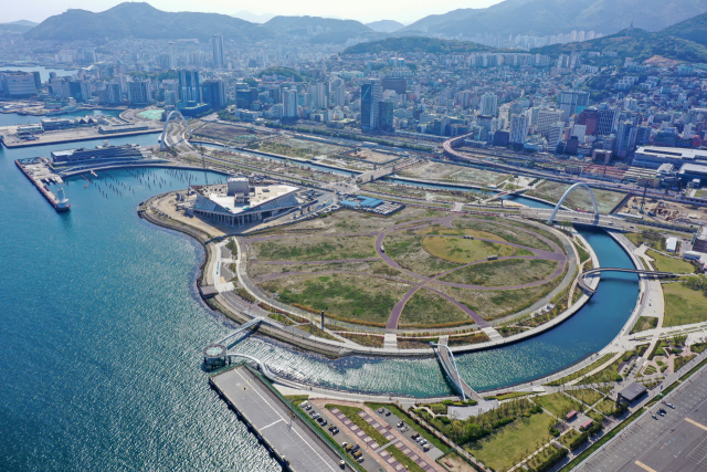 부산 북항 야구장 건립이 거대 양당(더불어민주당·국민의힘) 대선 후보 공약에 포함되지 않을 가능성이 커지고 있다. 부산 북항 재개발 1단지 내 랜드마크 부지와 일대 전경. 김종진 기자 kjj1761@