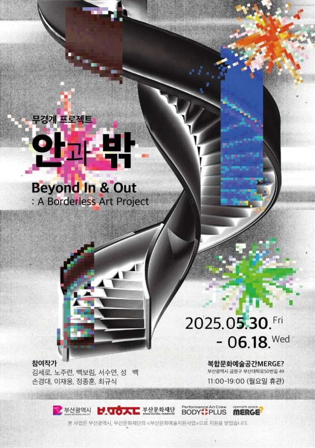 예술단체 ‘몸더하기’가 안과 밖이라는 소재로 선보이는 기획전. MERGE?는 “이번 프로젝트는 예술과 일상의 경계를 허무는 실험으로, 전시장 안에만 머물지 않고, 공간의 바깥까지 확장되어 일상적인 장소에서 예술의 감각을 다시 발견하고자 한다”고 밝혔다. 참여 작가는 김세로 노주련 백보림 서수연 성백 손경대 이재웅 정종훈 최규식. ▶5월 31일(토)~6월 18일(수) 부산 금정구 복합문화예술공간MERGE?(부산대학로 50번길 49). 관람 시간 오전 11시~오후 7시. 월요일 휴관.