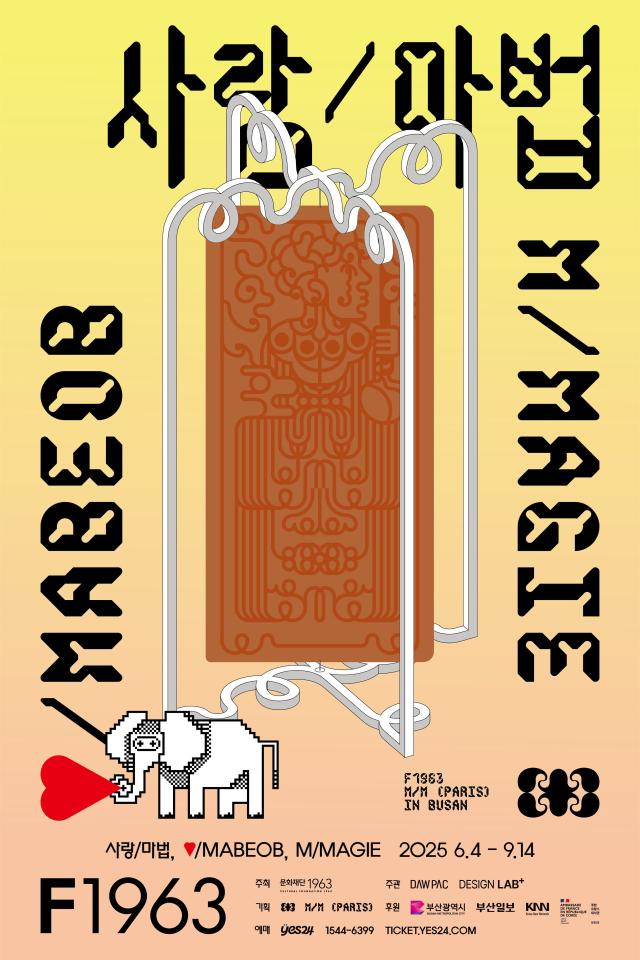 복합문화공간 F1963이 선보이는 크리에이터 듀오 M/M(Paris)의 대규모 기획전. 신작도 있지만 이전 전시에서 선보였던 이미지 파편을 불러오거나 새롭게 엮고, 스케일과 구성을 변형하는 식으로 전개해 그간의 작업 궤적도 ‘퍼즐’처럼 흥미롭게 되짚어볼 수 있다. 타로 카드에서 영감을 받은 시간과 공간을 넘나드는 대형 설치 작품과 영상물을 선보인다. 작가들이 직접 디자인한 타로카드 78장은 처음 공개된다. 아트 포스터 250여 점도 등장한다. 프랑스 파리를 기반으로 활동하는 M/M(Paris)의 부산 첫 전시이자 2017년 서울에서 개인전을 가진 이래 7년 만에 한국을 찾는다. 1992년 결성된 M/M(Paris)은 마티아스 오귀스티니악(1967년생)과 미카엘 암잘라그(1968년생)로 구성된다. 전시 공간은 6개 구역으로 나눠서 알파벳 스툴 ‘B,U,S,A,N’이 설치된 로비부터 작품이 차례로 펼쳐지며 작가들이 붙인 저마다의 이름을 지니고 있다. 부산(Busan)→해운대(Haeundae)→코펜하겐(Copenhagen)→마법(Mabeob)→마지(Magie)→테베(Thebes)의 순서다. 전시명에 포함된 ♥는 자신들의 이니셜인 ‘M’과 발음이 유사한 프랑스어 단어 ‘AIME’(사랑)를 병치하는 방식의 기호다. ▶6월 4일(수)~9월 14일(일) 부산 수영구 F1963 석천홀. 관람 시간 오전 10시~오후 6시. 매주 월요일 휴관. 입장료 성인 1만 3000원, 청소년 1만 원, 어린이 7000원.