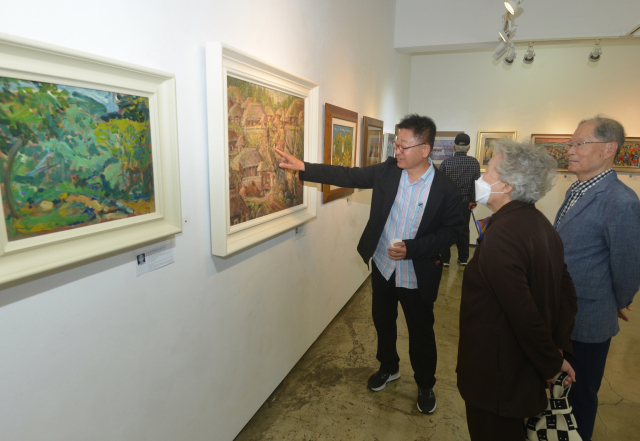 지난달 29일 ‘꽃피는 부산항 12회’전에 참석한 원로 작가들이 전시장을 돌아보고 있다. 미광화랑 제공