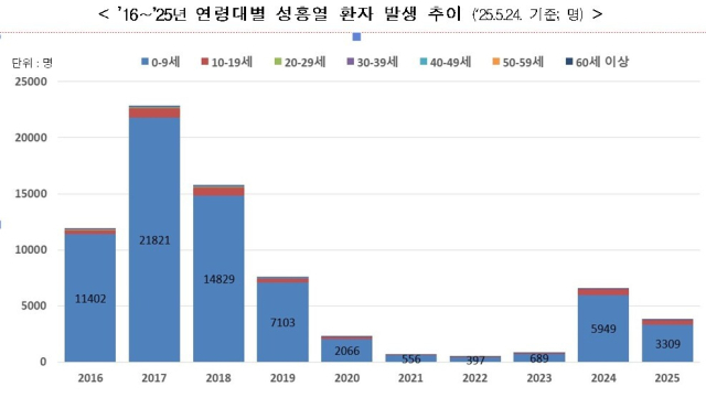 4일 질병관리청에 따르면 지난달 24일 기준 성홍열 환자 신고 건수는 3809명으로, 지난해 같은 기간(1506명)보다 2.5배 늘어났다. 이 기간 신고된 환자 대부분(86.8%)은 10세 미만인 것으로 조사됐다.