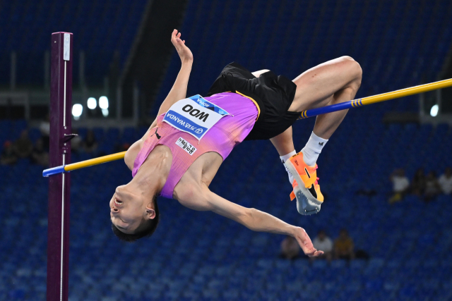 우상혁이 7일(한국 시간) 이탈리아 로마에서 열린 2025 로마 다이아몬드리그 대회 남자 높이뛰기에서 2m32를 넘어 우승을 차지하고 있다. EPA연합뉴스