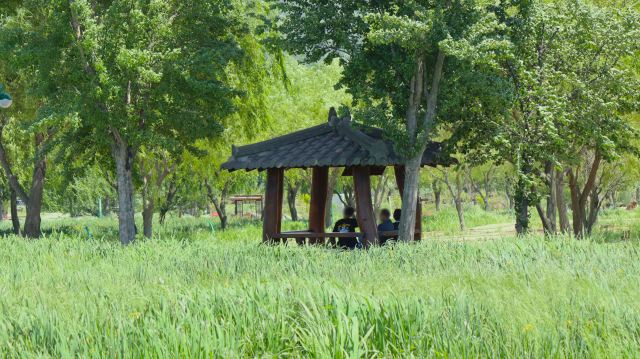 자연주의정원 바로 옆은 버들습지와 바람개비광장이다. 지난 5월만 해도 수레국화와 작약, 노란꽃창포로 가득 메워졌던 곳이지만 지금은 파란 풀이 뒤덮여 있다. 세상을 다 뒤덮은 것 같은 풀을 바라보고 있으려니 눈동자까지 푸르러지는 기분이다. 잎이 우거진 각종 나무 아래에는 정자 여러 개가 보인다. 빈자리라고는 하나도 없이 정자마다 사람들이 앉아 있다. 지금 이 날씨에 저곳에서 쉬는 것만큼 좋은 휴식, 피서는 없다는 뜻이다.