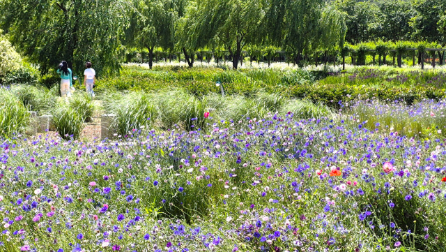 경남 거창군 창포원을 찾은 관람객들이 수레국화가 핀 정원 옆을 지나고 있다. 남태우 기자