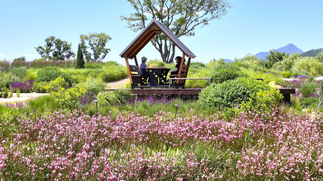 경남 거창군 창포원 자연주의정원의 오각형 쉼터에서 관람객들이 휴식하고 있다. 남태우 기자