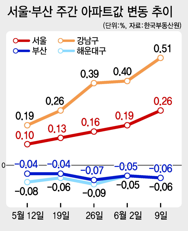 17일 한국부동산원에 따르면 지난주 서울 아파트의 주간 매매가격은 전주 대비 0.26% 올라 지난해 8월 이후 최대 상승률을 기록했다. 아파트 매매 거래량도 4월 5410건에서 지난달 7010건으로 한 달 만에 29.6%나 급증했다. 토지거래허가구역 확대 재지정으로 한때 주춤했던 아파트 가격과 거래량이 빠르게 상승하고 있는 것이다.