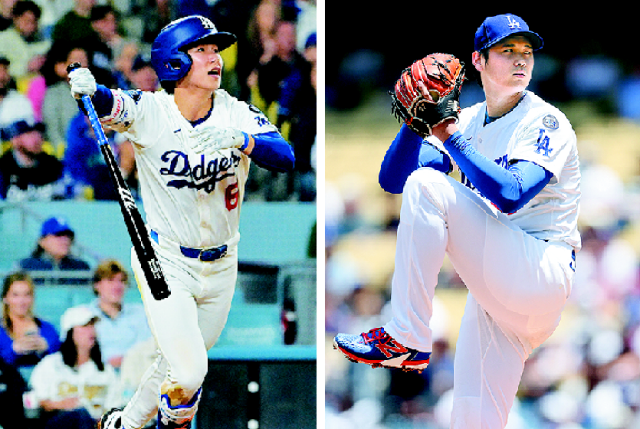 시즌 8번째 장타를 기록한 다저스의 김혜성(왼쪽 사진)과 두 번째 등판에서 1이닝 무실점으로 완벽투를 선보인 오타니 쇼헤이. AP연합뉴스