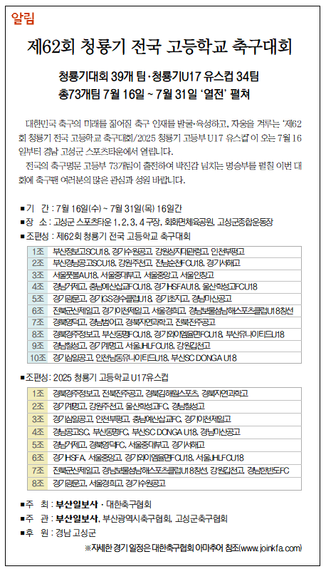 대한민국 축구의 미래를 짊어질 축구 인재를 발굴·육성하고, 자웅을 겨루는 ‘제62회 청룡기 전국 고등학교 축구대회/2025 청룡기 고등부 U17 유스컵’이 오는 7월 16일부터 경남 고성군 스포츠타운에서 열립니다.