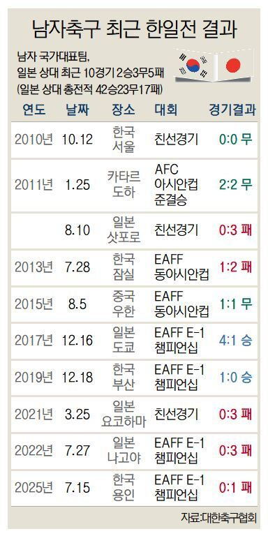 한일간의 격차는 지난 15일 끝난 동아시안컵에서도 여실히 드러났다. 홍명보 감독이 이끄는 한국 축구대표팀은 이날 용인 미르스타디움에서 열린 2025 동아시아축구연맹(EAFF) E-1 챔피언십(동아시안컵) 최종 3차전에서 전반 8분 만에 실점해 0-1로 패했다.