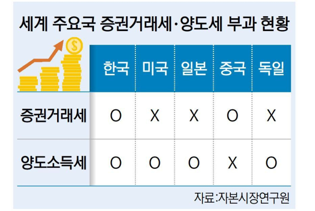 증권거래세와 관련해서는, 미국이 증권거래세 없이 일정액의 수수료(지난 5월까지 0.0008%)를 물리다 내년 5월까지는 이마저도 없애버렸고 중국도 2023년 0.1%이던 것을 절반으로 인하해 0.05%로 낮춘 바 있다. 일본은 주식 시장 활성화를 위해 1989년부터 증권거래세를 단계적으로 인하하다 1999년에는 아예 폐지했다.