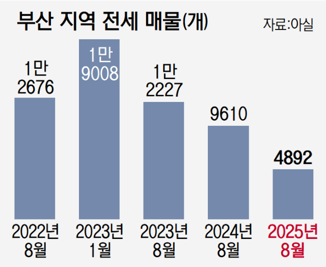 5일 부동산 빅데이터 플랫폼 아실에 따르면 이날 기준 부산 지역 부동산에 등록된 전세 매물은 4892개로 지난해 9610개에 비해 49%가량 감소했다. 전세 매물이 5000개 아래로 떨어진 건 아실이 관련 통계를 집계하기 시작한 2022년 8월 이후 처음이다. 2023년 1월의 경우 부산에서 전세 매물로 1만 9008개가 등록될 정도였으니 고점과 비교하면 2년 반 만에 4분의 1 수준으로 줄었다.