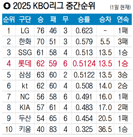 이호준의 홈런을 시작으로 롯데는 이날 5회·8회 각각 2점을 올리며 5-1로 승리했다. 시즌 전적 62승 6무 59패를 기록한 롯데(승률 0.5124)는 승차 없이 3위 SSG(승률 0.513)에 이어 리그 4위를 지켰다.