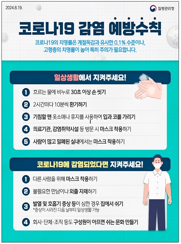 질병청은 이달까지는 코로나19 유행이 지속될 것으로 예상된다며, 손 씻기와 주기적 실내 환기 등 예방수칙을 지켜달라고 당부했다.