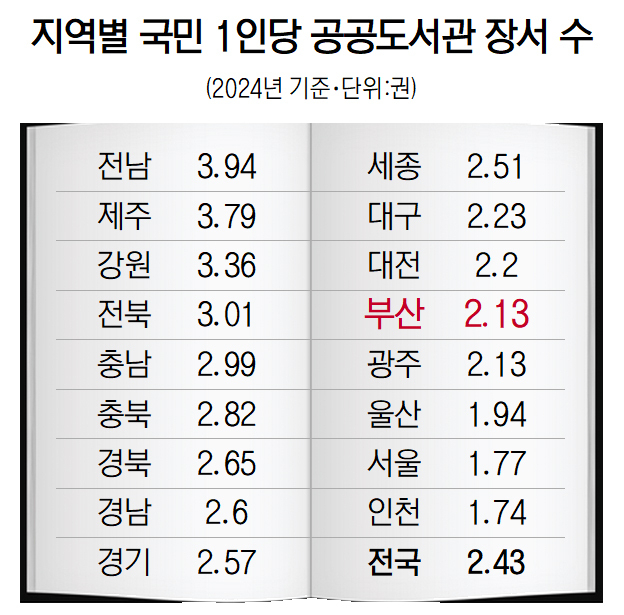 국가도서관통계시스템에 따르면 지난해 부산 공공도서관의 부산 시민 1인당 장서 수(2.13권)는 전국 평균(2.43권)보다 0.3권 적은 전국 13위에 그쳤다. 부산 시민이 도서관에 10번 방문했을 때 이용할 수 있는 자료 수가 전국 평균보다 3권 적은 셈이다. 부산의 전체 55곳 공공도서관 가운데 전국 평균보다 1인당 장서 수가 적은 도서관은 37곳(약 70%)에 달한다.