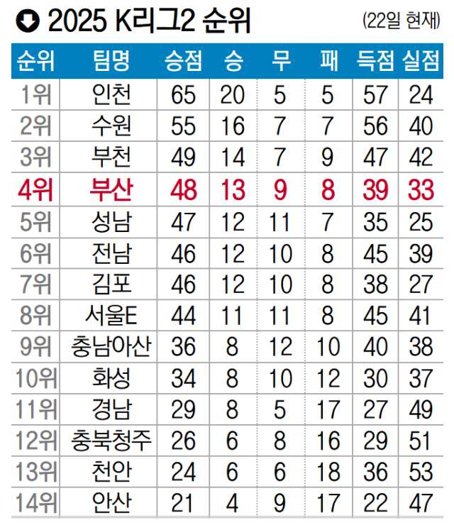 4승 2무로 최근 6경기 무패 행진을 간 부산은 13승9무8패(승점 48)를 기록하며 4위를 유지했다. 이날 승점 3점을 획득했으면 부천(승점 49)을 제치고 3위를 차지할 수 있었지만, 무승부로 승점 1점 차 4위에 만족해야 했다.