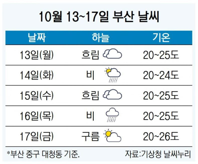 13일 아침 최저기온은 부산 20도, 울산 19도, 경남 18~20도로 평년(7~15도)보다 5~11도 높겠고, 낮 최고기온은 부산 26도, 울산 22도, 경남 22~26도로 평년(22~24도)보다 1~3도 높겠다. 14일 최저기온은 17~20도, 최고기온은 20~23도로 전망됐다.