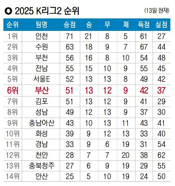 부산은 13일 현재 13승12무9패(승점 51)로 리그 6위에 머물러 있다. 1부 리그 승격을 위한 플레이오프(PO) 진출권(1~5위)에서 벗어났다.