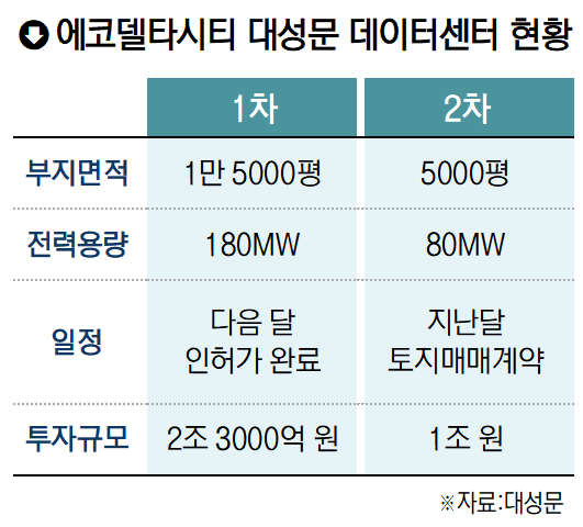 대성문이 최대 주주로 참여한 ‘부산에코델타그린데이터센터 PFV’는 1단계 사업 수전 용량 100MW 설계를 완료한 상황이다. 올해 관련 인허가 절차를 마무리하고 1차 사업을 본격 추진할 계획이다.