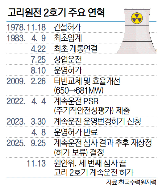 원자력안전위원회가 고리원전 2호기(부산 기장군 장안읍 소재) 계속운전(설계수명 연장) 허가를 두 번의 보류 결정 및 세 번째 심의(심사) 끝에 13일, 재적 위원 표결로 전격 승인하면서 심사 대기 중인 나머지 국내 원전 9기도 심사에 속도가 날지 주목된다.