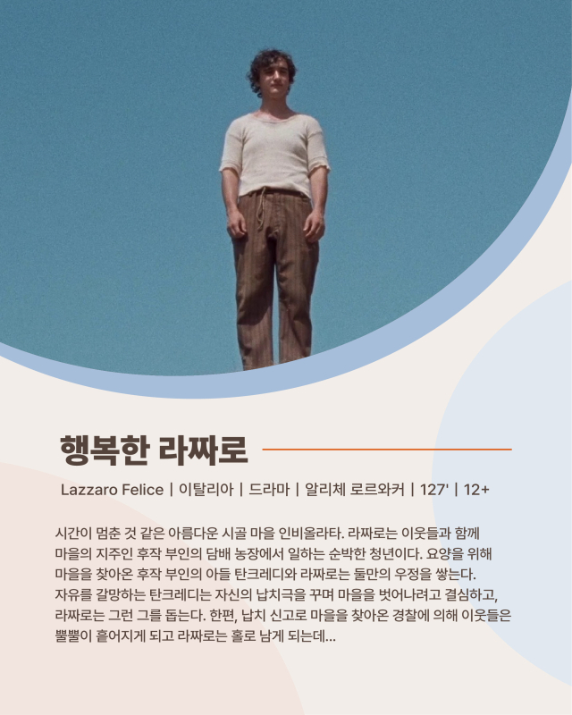 이탈리아 거장 알리체 로르바케르가 연출한 ‘행복한 라짜로’는 시골 마을 농장에서 일하는 순박한 청년 라짜로(아드리아노 타르디올로)가 자유를 갈망하는 친구 탄크레디(루카 치코바니)의 납치 자작극을 돕다가 벌어지는 일을 그리는 작품이다.