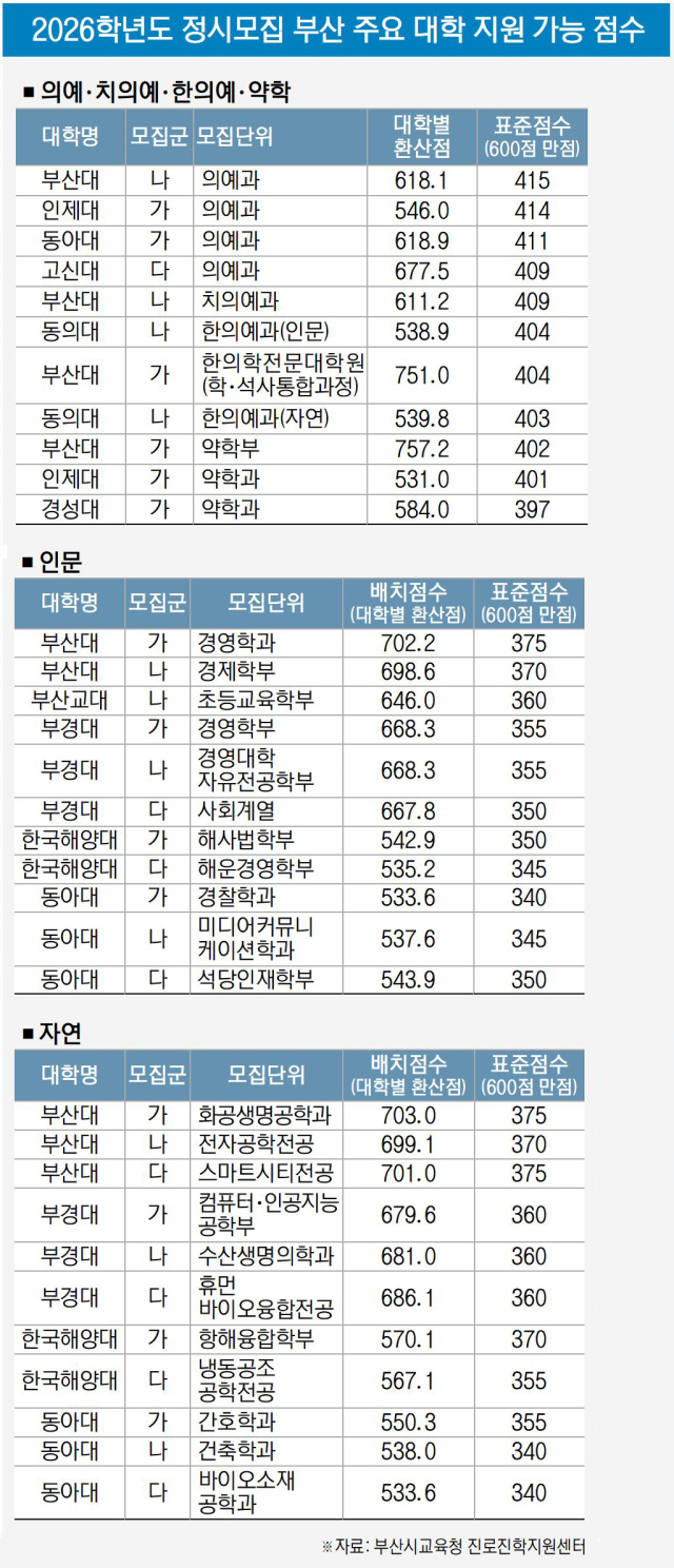 부산대 의예 415점·자유전공 375점… 부산 15개 대학 정시 참고표 공개