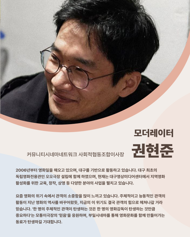 한편 부일시네마에선 영화 상영 뒤에 관람객들끼리 감상을 공유하는 ‘커뮤니티 시네마’가 이어진다. 대구 최초 독립영화전용관인 ‘오오극장’ 설립에 참여한 권현준 커뮤니티시네마네트워크 사회적협동조합이사장을 모더레이터로 초청했다.