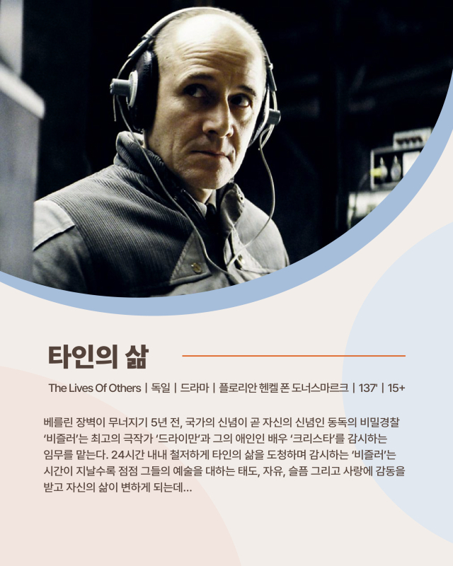 2007년 제79회 미국 아카데미 시상식에서 외국어영화상을 수상한 ‘타인의 삶’은 베를린 장벽이 무너지기 5년 전인 1984년을 배경으로 하는 드라마다.