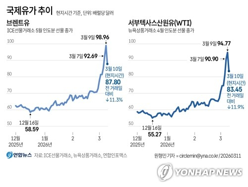 한때 배럴당 100달러를 훌쩍 넘어섰던 국제유가는 80달러대를 유지하고 있다. 10일(현지시간) 런던 ICE선물거래소에서 5월 인도분 브렌트유 선물 종가는 배럴당 87.8달러로 전장보다 11% 급락했다.