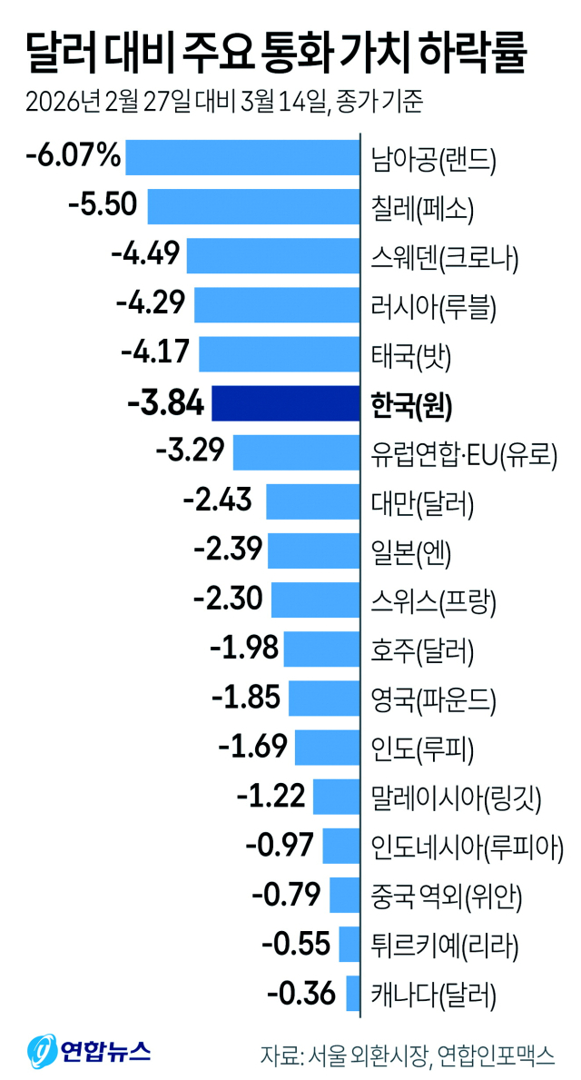 이달 원화 가치가 주요국 통화 대비 가장 큰 폭으로 하락했고 원달러 환율 평균도 1470원을 넘으며 외환위기 이후 최고치를 기록했다. 특히 중동 사태 악화로 국제 유가가 100달러 이상을 유지하면 1500원대 환율이 고착화할 것이란 우려가 나온다.