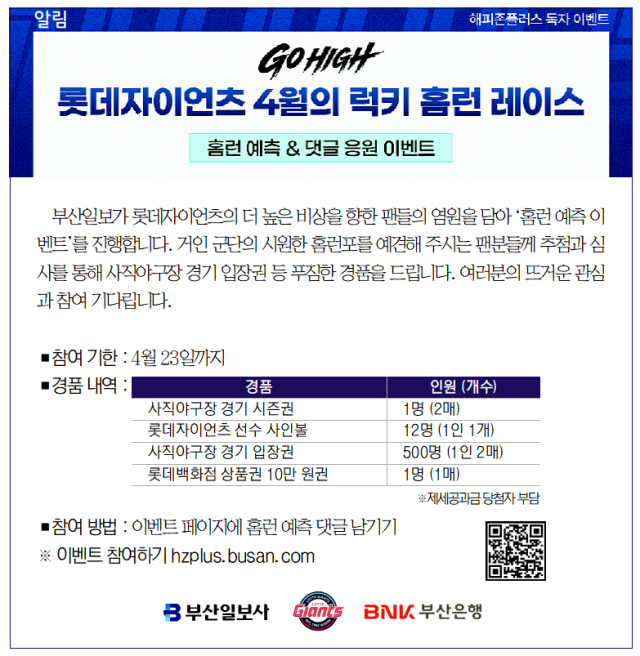 부산일보가 롯데자이언츠의 더 높은 비상을 향한 팬들의 염원을 담아 '홈런 예측 이벤트'를 진행합니다. 거인 군단의 시원한 홈런포를 예견해 주시는 팬분들께 추첨과 심사를 통해 사직야구장 경기 입장권 등 푸짐한 경품을 드립니다. 여러분의 뜨거운 관심과 참여 기다립니다.