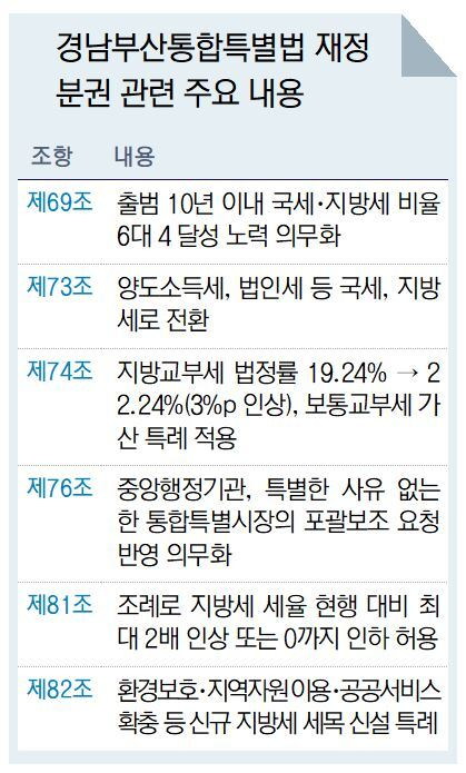 부산·경남 지역 의원 28인이 발의한 ‘경남부산통합특별시 설치 및 경제·산업수도 조성을 위한 특별법'에는 국세인 양도소득세 등을 지방에 이양하는 파격적인 재정분권 조항이 담겼다. 재정분권 논의가 선언 수준에 머물고 있다는 비판 속에서 나온 구체적 입법 시도라는 점에서 주목된다.
