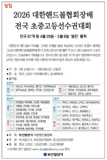 대한민국 핸드볼의 미래를 그려갈 인재를 발굴·육성하고 선의의 경쟁이 펼쳐질 ‘2026 대한핸드볼협회장배 전국 초중고등선수권대회’가 오는 4월 29일부터 스포츠산업도시 고성군에서 개최됩니다. 전국의 핸드볼 명문 67개 팀이 출전하여 박진감 넘치는 명승부를 보여줄 이번 대회에 여러분의 많은 관심과 성원 바랍니다.