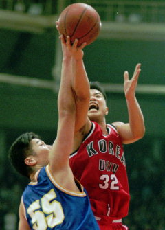 올해 대졸 신인중 최대어로 손꼽혀온 현주엽이 9일 오후 힐튼호텔 컨벤션홀에서 열린 한국농구연맹(KBL) 신인드래프트에서 1순위 1지명권을 얻은 정규리그 '꼴찌' SK에 낙점돼 오는 12월 개막 예정인 다음 시즌에 공식 데뷔하게 됐다(사진은 지난 2월 농구대잔치 준결승에서 SK와 이미 계약한 연대 서장훈과 맞붙은 모습).프로농구 드래프트