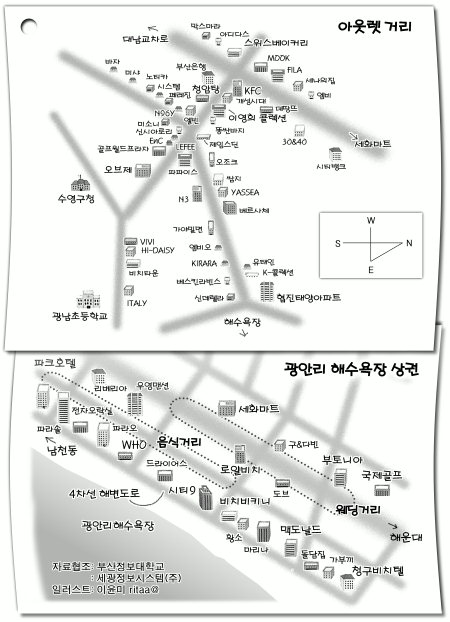 백사장에서 밤새 이야기하던 젊은 날의 추억,10대들의 해방구였던 광안리해수욕장은 젊은층이 경성대 앞과 해운대 카페촌으로 옮겨가면서 특색 없는,대중적인 거리로 전락하고 있다.