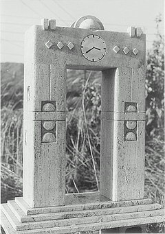 부산시가 공모한 해운대 달맞이언덕 해월정에 세워질 "새천년맞이 기념 시계탑" 당선작 모형(사진). 당선작은 정성룡(36).전옥씨(34)의 공동작품으로 작품이름은 "새천년의 문". 과거역사를 지나 미지의 세계로 진입하는 입구를 표현한 것이다. 이춘우기자 bombi@