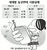 문화관광부가 대구대 국문학과 이정복 교수팀에 용역을 의뢰,최근 발표한 '바람직한 통신언어 확립을 위한 기초연구' 보고서에 따르면 각종 게시판 등 PC통신과 인터넷을 사용하는 20대 네티즌의 83.3%가 비속어를 사용하고 있으며,10대의 39.1%가 은어를 상습적으로 표현하고 있는 것으로 나타났다.