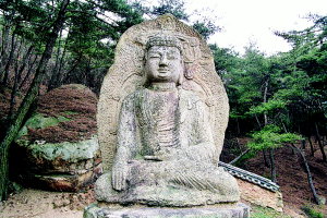 이 골짜기의 이름을 따서 미륵불이라고도 하고,광배 뒤에 동방 약사여래가 있다고 해서 서방정토 아미타불이라고도 하고,수인으로 봐서는 항마촉지형의 석가모니불이라고도 볼 수도 있지만 안내판에는 미륵곡 석불좌상이라 해놓았다. 석불좌상은 비록 동쪽으로 보고 있지만 계집종 욱면의 극락 사연과 연결시켜 보면 아미타불이 아닐까도 싶다. 하여튼 이 불상은 석굴암 본존불과 연결되는,남산에 남아 있는 불상 중에는 가장 완전한 모습을 갖추고 있다. 몸에 비해서 얼굴이 크지만 워낙 인자하고 수줍어 어색하지 않은 수준 높은 불상이 되었다. 목에 있는 3도(三道,3개의 주름)는 미혹하면 업을 낳고 업은 다시 고통을 낳는다는 이 윤회의 업보를 끊겠다는 것이다. 자비하신 부처님,우리 모두의 미혹과 업,고통을 소멸시켜주소서. 정좌한 발은 대지를 두루 편안하게 한다는 평발인데 여기서는 우리네 인생의 굴곡을 새겨놓고 발가락까지 도드라지게 표현해 놓았다. 부분 부분도 소홀히 하지 않고 전체의 조화를 이룬 따뜻한 정이 흐르는 아름다운 불상이다. 뒤쪽 광배는 앞 불상 등 뒤의 둥근 받침만 도드라지게 새겨 연결시켜 놓았다. 배 모양의 광배 뒤 약사여래는 얼굴이 거의 마모되어 희미했지만 왼손에 둥근 약 그릇은 누구를 위한 것일까. 너와 나 어리석은 우리들 중생 모두를 치료한다고 약 그릇이 마를 날이 없구나.