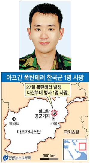 병역의무를 다하겠다며 자원입대해 아프가니스탄에 파병된 27세 꽃다운 나이의 청년이 폭탄테러로 아까운 생명을 잃었다. 파병지역에서 활동하던 적대세력 또는 테러단체의 공격으로 우리 군 장병이 목숨을 잃은 사례는 1965년 베트남전 파병 이후 이번이 처음이다. ▶관련기사 3면
