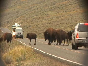 미국 소인 바이슨이 옐로우스톤 내 개설된 도로를건너면서 탐방객들의 차량을 가로 막고 있다