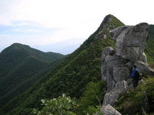 이렇게 반론을 제기하는 것은 괘관산엔 대단한 암릉인 북릉이 있기 때문이다. 그 암릉을 타보지 않고 산 전체를 평가하는 것은 '월권'이라 하겠다. 북릉은 공룡의 등짝처럼 바위와 암릉으로 울퉁불퉁하다. 특히 정상 전위봉인 첨봉은 흡사 삼각추처럼 날카로운 알프스의 마터호른 같다. 물론 가까이 다가가면 더욱 위압적이다. 그 정수리에 한 사람이라도 올라갈 수 있는 틈이 있을까 상상만 해도 오금이 저리는 정도다. 산행대장은 그 위압감이 송곳니처럼 뾰족한 암봉으로 유명한 황석산 이상이라고 한다.