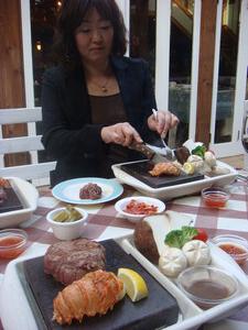 스톤그릴 스테이크(3만원대)를 맛봤다. 돌을 450도까지 달궈 그 위에 큼직한 스테이크와 랍스터를 올린 것이다. 특징은 '지글지글', 고기가 익어가는 소리를 함께 먹는다는 것. 원하는 만큼 고기를 익혀 잘라 먹으면 된다. 게으른 사람에게는 어떻겠냐 싶기도 한데 고기를 뒤집어 가면서 익혀 먹는 재미는 괜찮은 편이다. 자를 때 육즙이 배어나오기도 하는데 오 아까운 육즙이여, 하는 점도 있었다. 주방에서의 스테이크 두께 조절, 적당한 시간 맞추기, 순식간에 스테이크를 잘라 먹는 기술 따위가 어우러진 요리인 듯 싶었다. 랍스터와 스테이크를 오가는 맛의 전환이 특이했다. 거쳐 들어가는 입구의 '쇼부'도 황 사장이 운영하는 일본식 선술집이다. 051-518-3552.
