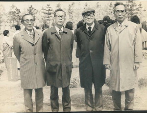 지인의 묘소를 함께 찾은 향파 이주홍(왼쪽 두 번째)과 요산 김정한(오른쪽 끝). 사진 제공=요산문학관'향파와는 40여 년을 사귀어 온 사이다. 해방 직후(1947년) 그가 동래고등학교 교사로 부임했을 때부터다. 술자리뿐 아니라 서로 집에까지 찾아다니며 술을 마시곤 했다. 동인지도 같이 내고 문인협회 같은 문학단체에도 같은 회원이 되었었다.'
