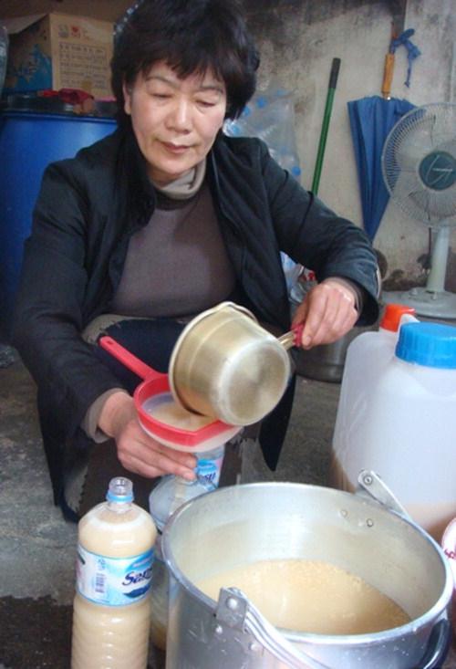 동동주 집의 문을 따고 들어가니 1말들이 통 14개가 차례를 기다리며 줄지어 서 있었다. "동동주를 빚는 데 물이 가장 중요하다"고 강씨는 말했다. 이 집에서 사용하는 물은 뒷산 봉화산의 물이다. 아주 좋은 물이라고 한다. 일주일에 이틀 동동주를 담는데 대략 16말을 빚는다고 한다. 금정산 산성마을에서 누룩을 가져오고, 찹쌀과 맵쌀을 적정 비율로 섞어 술을 빚는다. 요즘은 거의 맛볼 수 없는 누룩의 은근한 향이 술맛에서 감돌았다. 동행은 "조금 더 감돌았으면 좋겠다"고도 했다. 그러나 시중에 나와 있는 막걸리 이상의 맛이라는 데는 모두 동의했다. 단골에게 1말을 3만5천원에 판다고 한다.